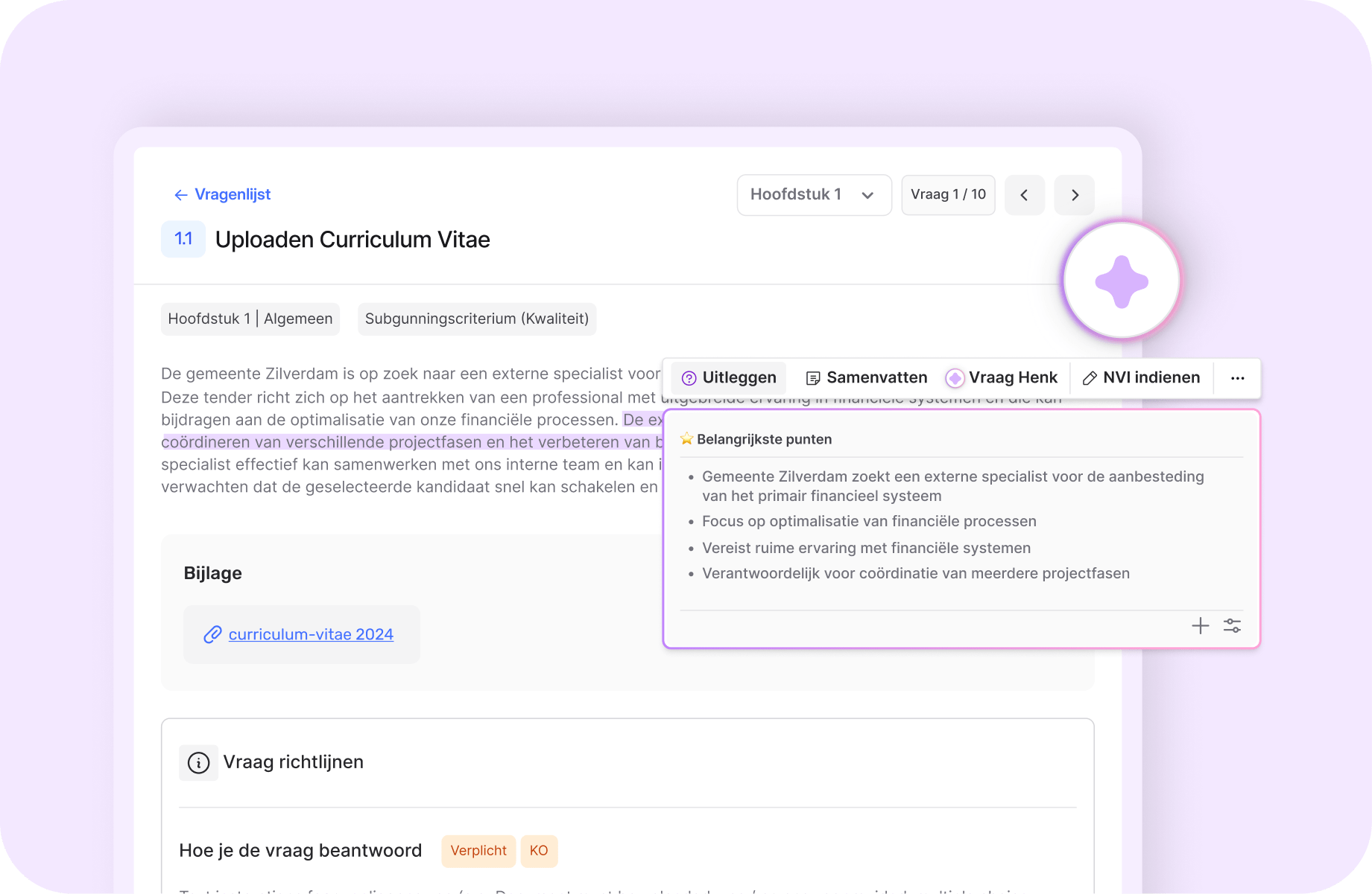 Onze Al-assistenten genereren aanbestedingen, controleren op fouten en ondersteunen evaluaties, zodat je sneller werkt, risico’s verlaagt en zelf de controle behoudt.